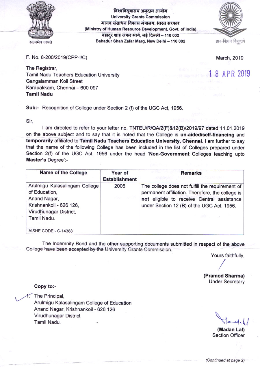 Arulmigu Kalasalingam College of Education, Anand Nagar, Krishnankoil is an unaided self-financing college affiliated to Tamil Nadu Teachers Education University, Chennai-5. It has been rendering quality teacher training and creating committed teachers to especially serve the rural folks in the economically backward areas like Watrap, Srivilliputtur for the past eight years.